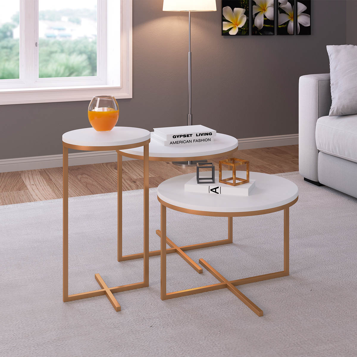 Conjunto 3 Mesas Volpi Branco/Dourado