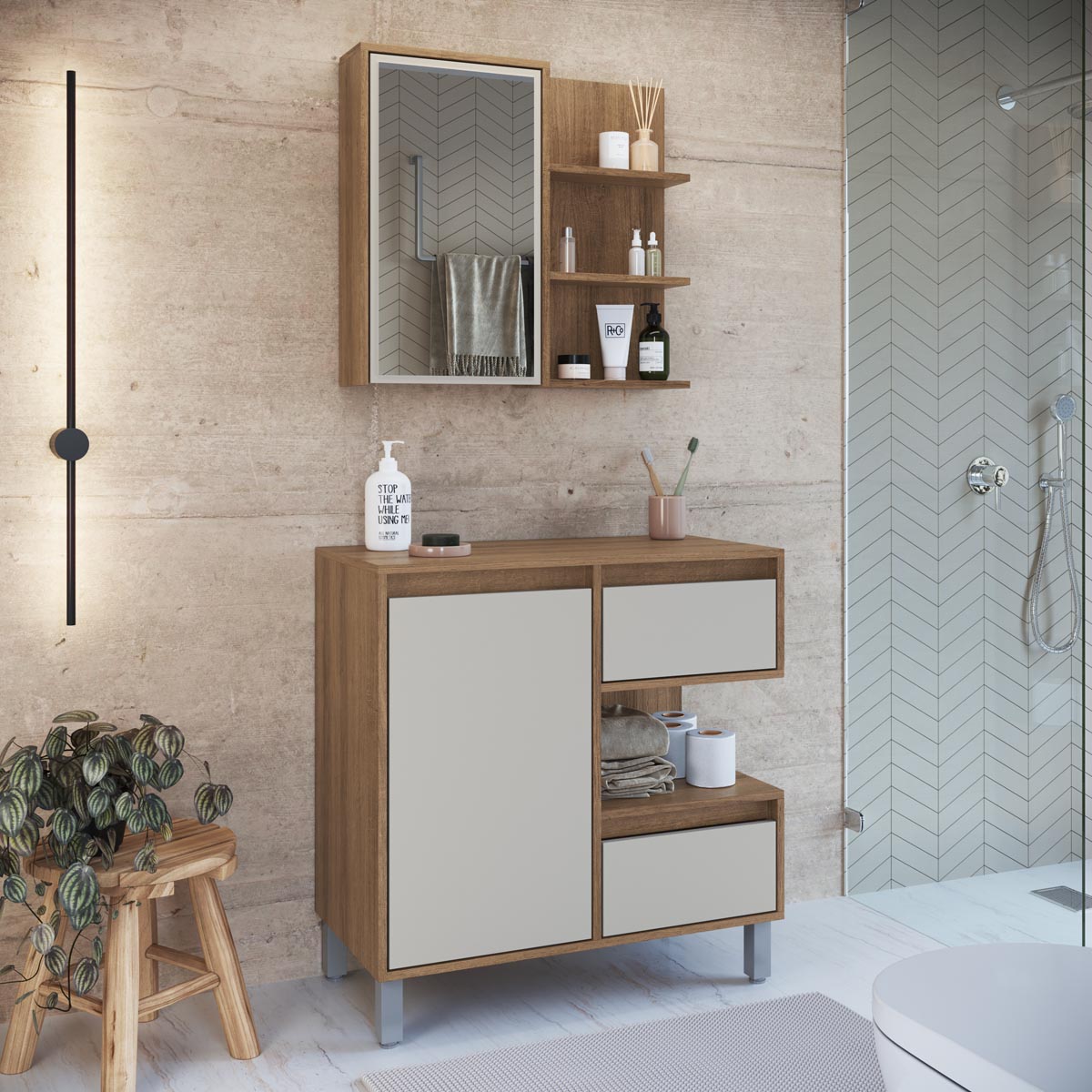 Gabinete de Banheiro 80cm Paula com Espelheira 1 Porta Mel/Arenas