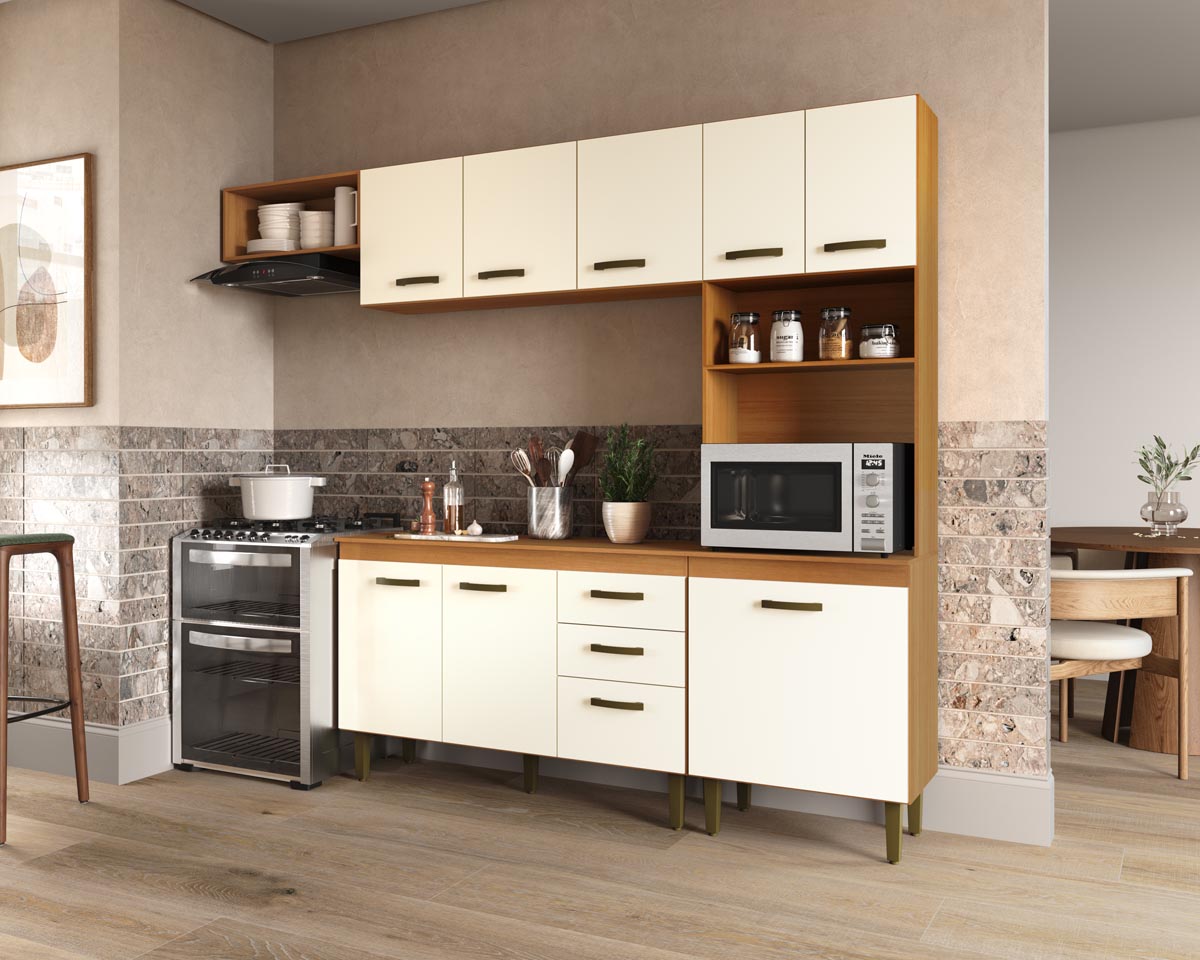 Conjunto de Cozinha Holly 240x199cm 9 Portas 2 Gavetas Nature/Champanhe