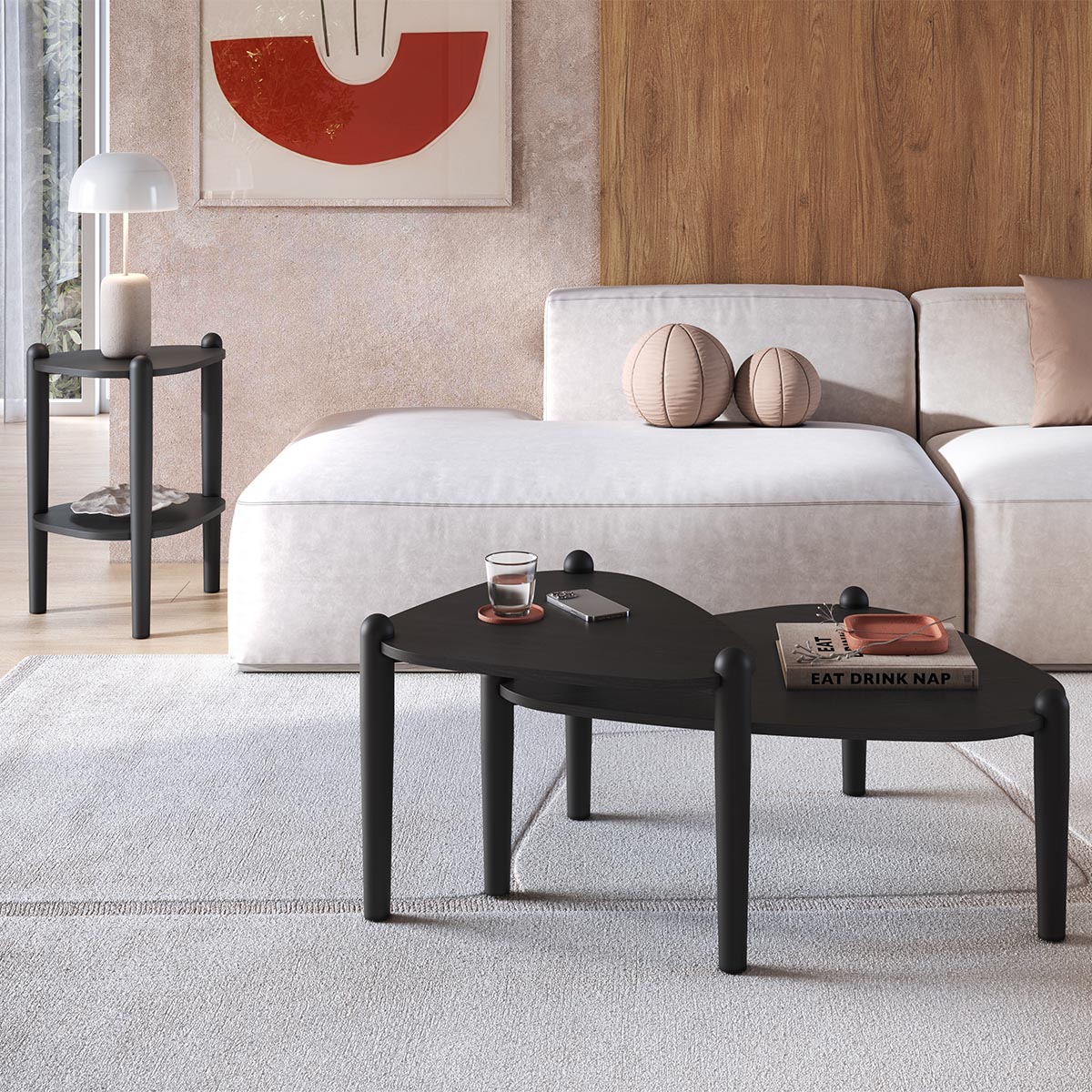 Conjunto Sala de Estar 2 Mesas de Centro e 1 Mesa Lateral Orgânica Pé Madeira